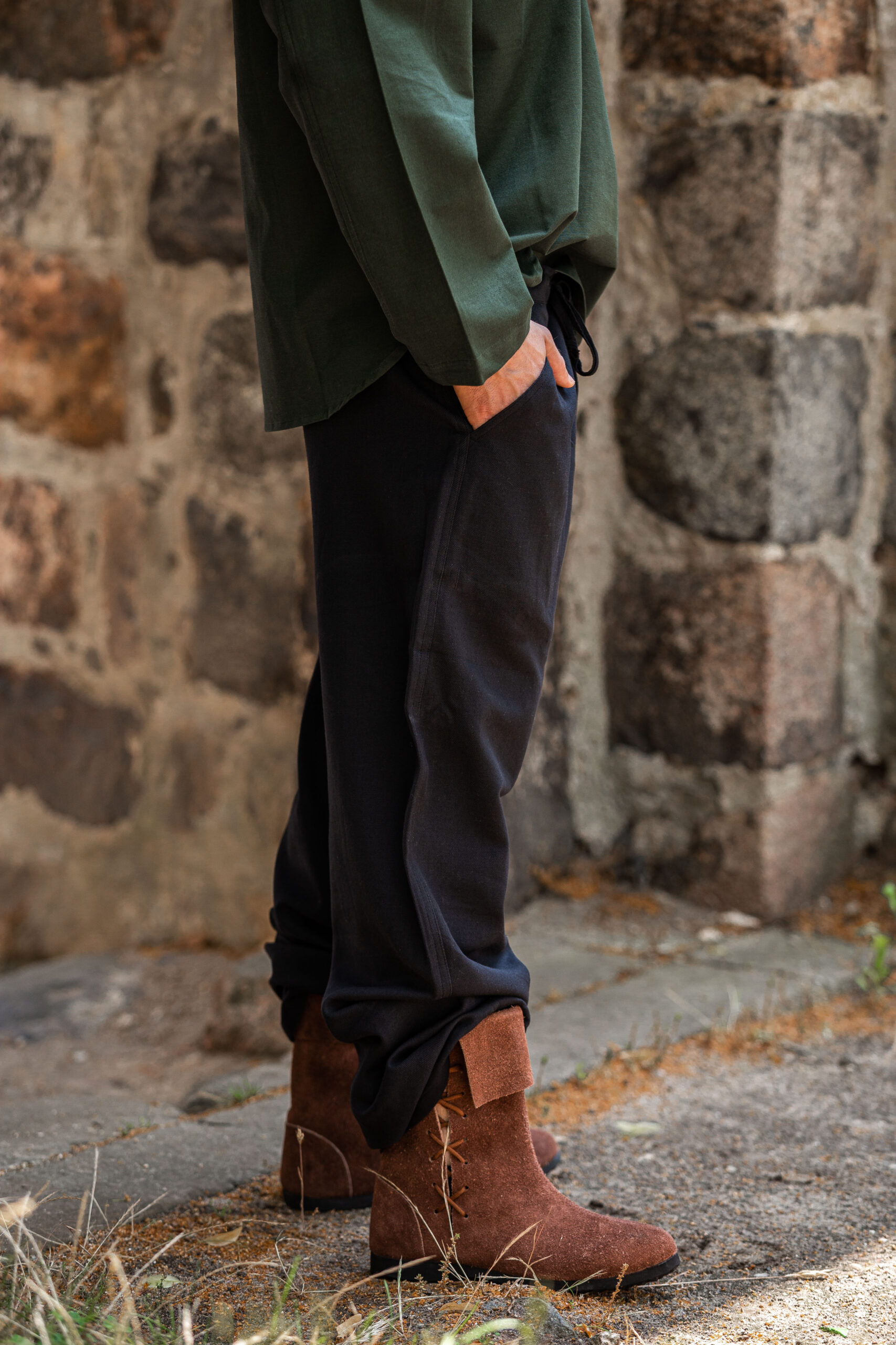 Ga op legendarische reizen met onze middeleeuwse broek Dirk. Deze broek is ontworpen met een losse, rechte pijp en biedt zowel comfort als stijl. De tailleband met trekkoord zorgt voor een verstelbare pasvorm, perfect voor elk avontuur dat je aangaat. Met een minimalistisch ontwerp en schuine zakken op de heupen is deze broek niet alleen functioneel, maar combineert hij ook moeiteloos historische inspiratie met moderne mode. Of je nu nieuwe gebieden verkent of lekker bij de open haard zit, deze broek is je trouwe metgezel.